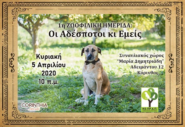 Με αφορμή την Παγκόσμια Ημέρα Αδέσποτων, το Corinthia.Events και η ΚοΠρΑΠ Κορινθία Προστασία Αστικής Πανίδας – CAR Corinthia Animal Rescue σας προσκαλούμε για να ακούσουμε, να συνομιλήσουμε και να μοιραστούμε με επιστήμονες, κτηνιάτρους, φορείς, εκπαιδευτικούς, θέματα, προβληματισμούς και εμπειρίες που αφορούν τη συμβίωση και τη συνύπαρξή μας με τα αδέσποτα ζώα.